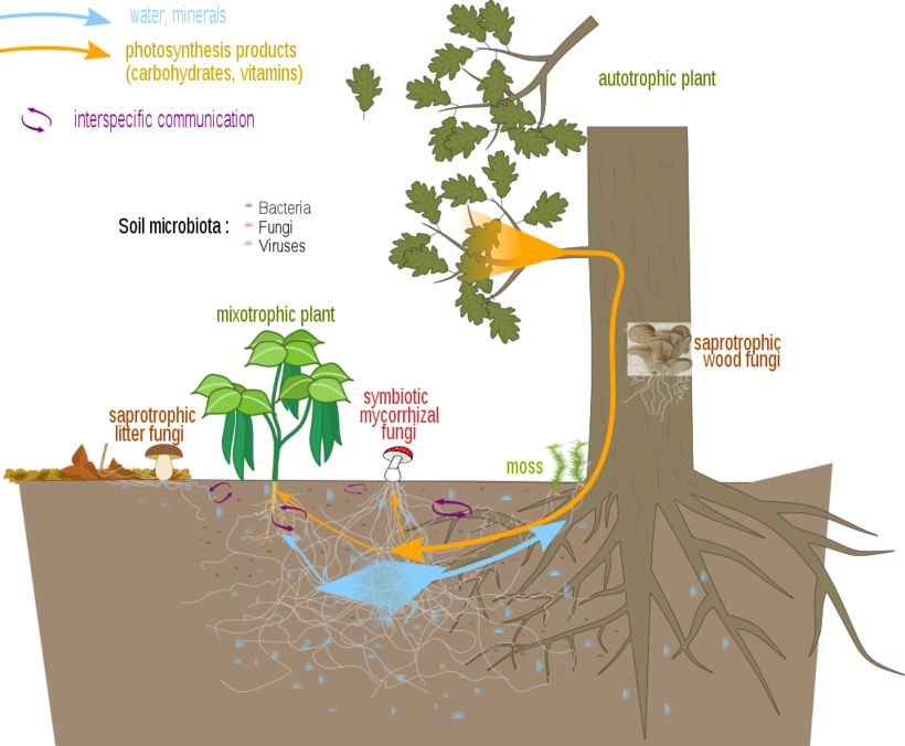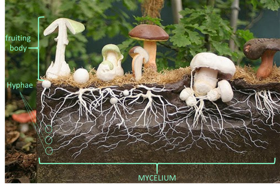 I’m referring to the mycorrhizal network, the word “mycorrhiza” comes from the Greek words “mykes” which means “fungus” and “rhiza” means “root”, so mycorrhizae are literally “fungus-roots.”